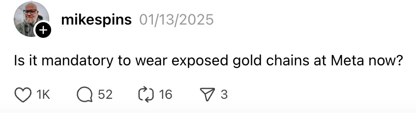 Before the inauguration, Mark Zuckerberg appeared on an episode of Joe Rogan with a fresh perm and a gold chain with a gold plate. Three days later, the head of Instagram, Adam Mosseri, posted a ratioed video about AI-enabling “improvements” to the platform, adorned in a blatant display of bling around his wrist and neck. Most of us reacted to both men as we would to an Italian inviting you on a boat — with instant and understandable suspicion.